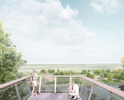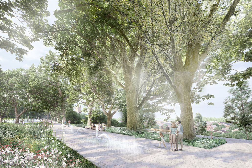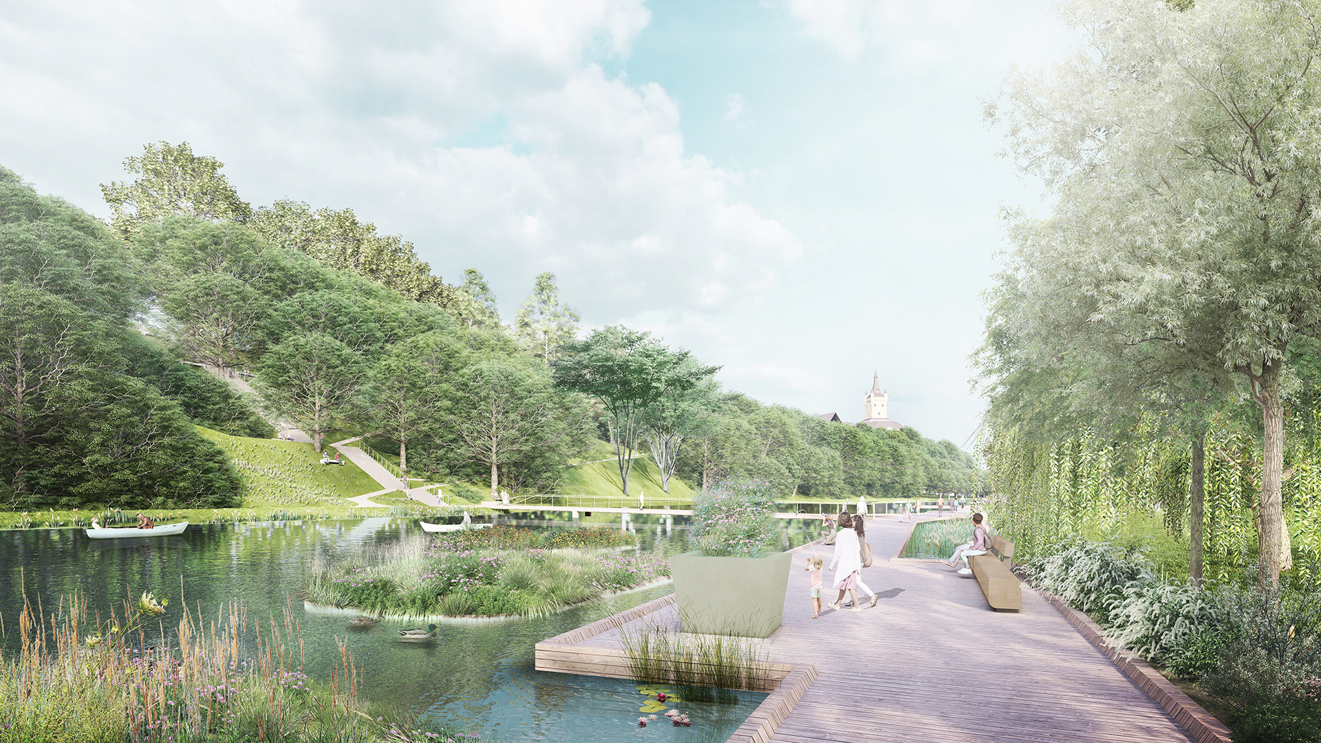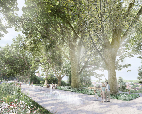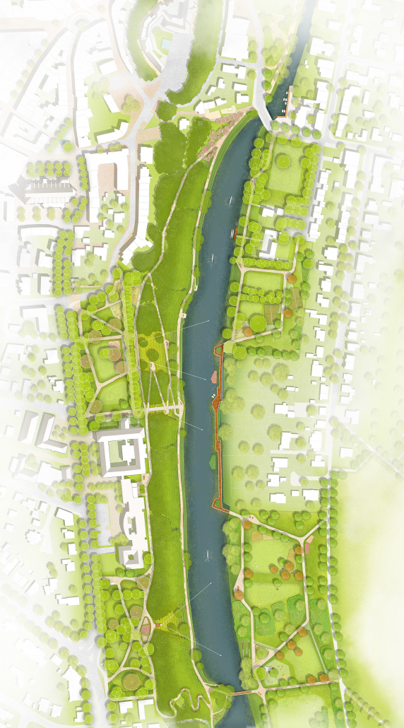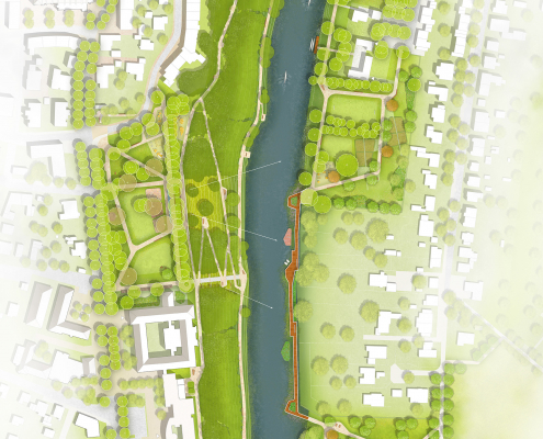 Unser Konzept „Ein- und Ausblicke“ vermittelt und verbindet zwischen den Raumstrukturen Stadt, Park, Gärten, Wald, Wasser, Landschaft und Natur. Dabei werden vor allem im Hangbereich Sichtachsen „von oben“ (Stadtraum) „nach unten“ (Landschaftsraum) und umgekehrt wiederhergestellt und durch neue Wegebeziehungen und Erlebnisräume vor allem östlich der Kermisdahl ergänzt. Der Entwurf greift den ursprünglichen Gedanken der Landschafts- bzw. Raumgestaltung auf, Achsen sternförmig auf einen Fokuspunkt zu lenken.