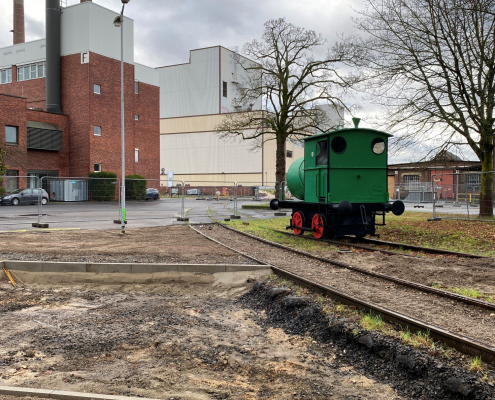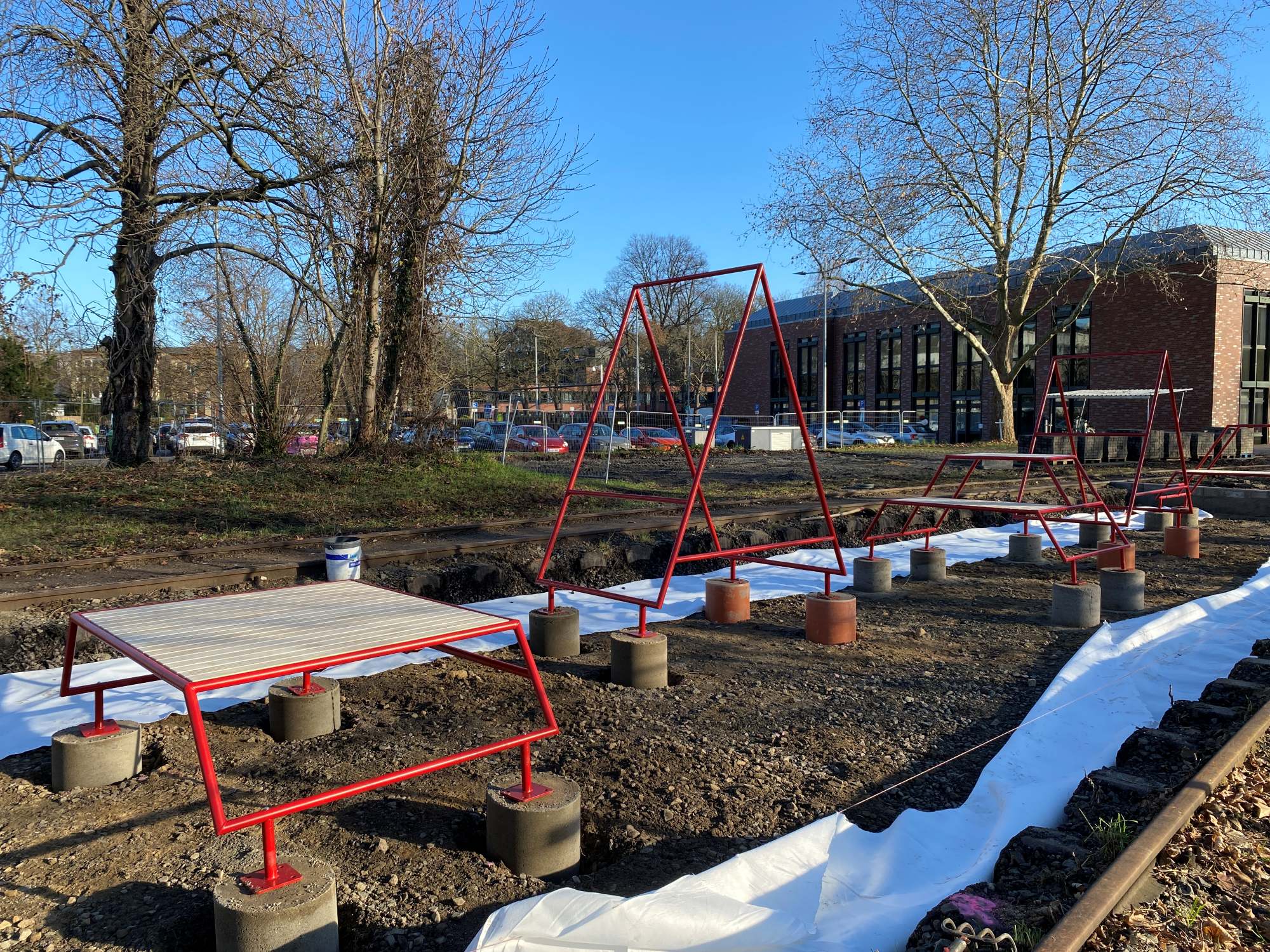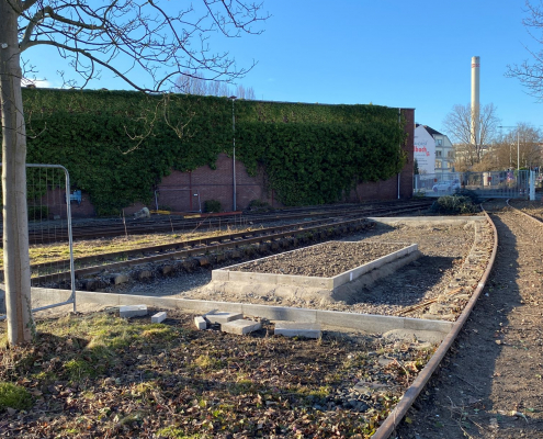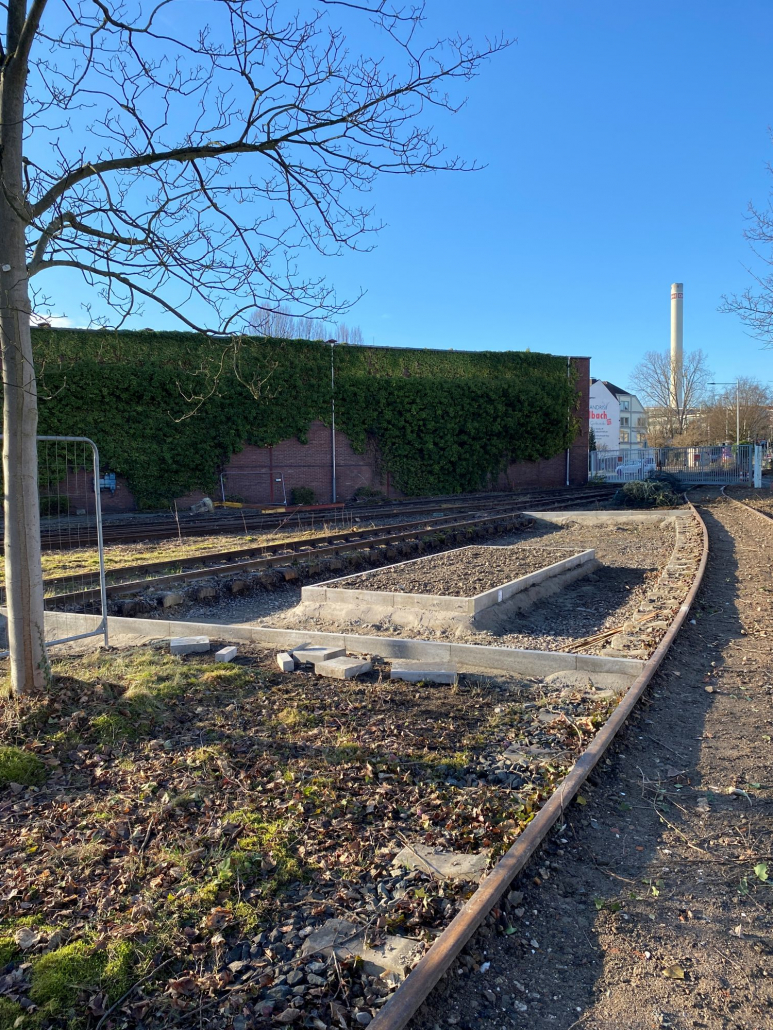 Die Baustelle des Bürger-Gleisparks, einem der ersten umgesetzten Projekte auf dem Zanders-Areal, entwickelt sich seit Baubeginn im November sichtbar weiter. In den vergangenen Wochen konnten bereits die Gleise für die zukünftigen Klinker- und Betonwege vorbereitet werden.