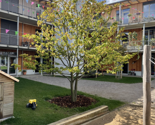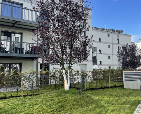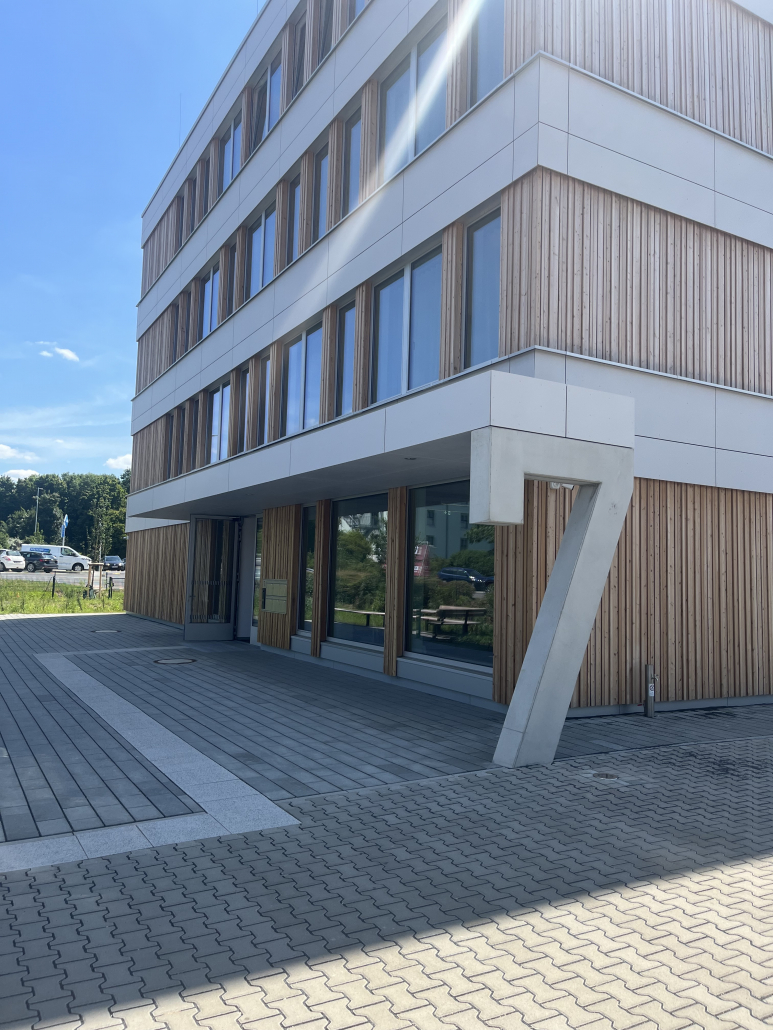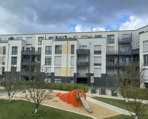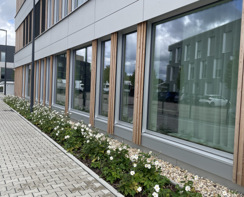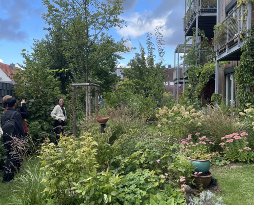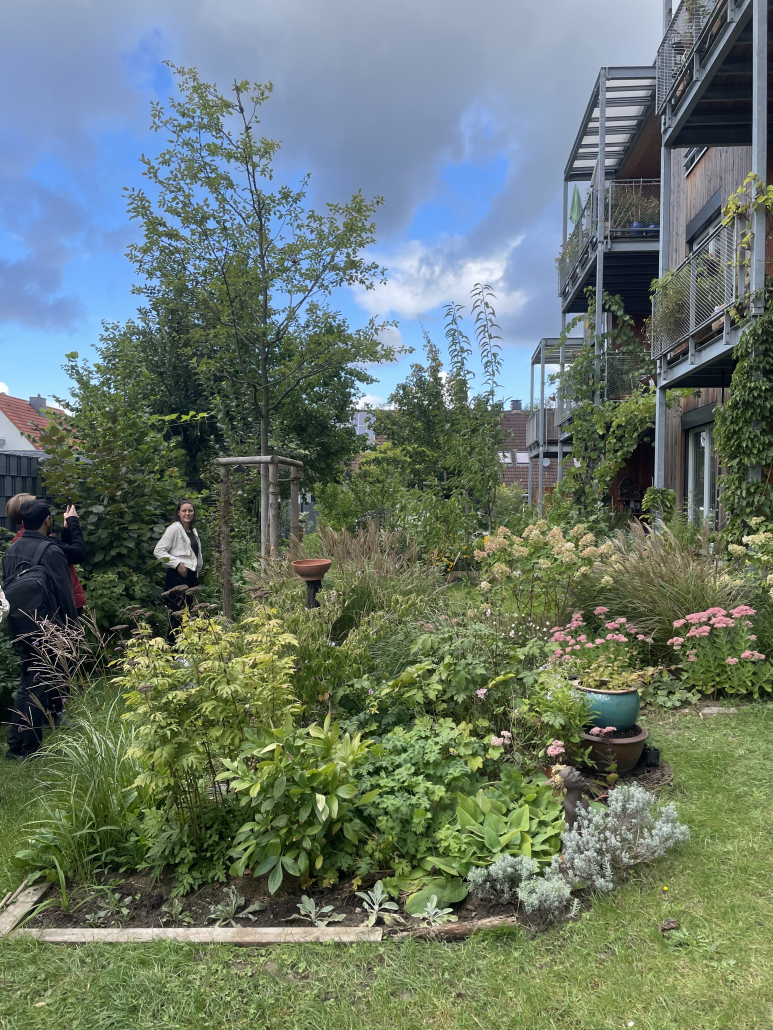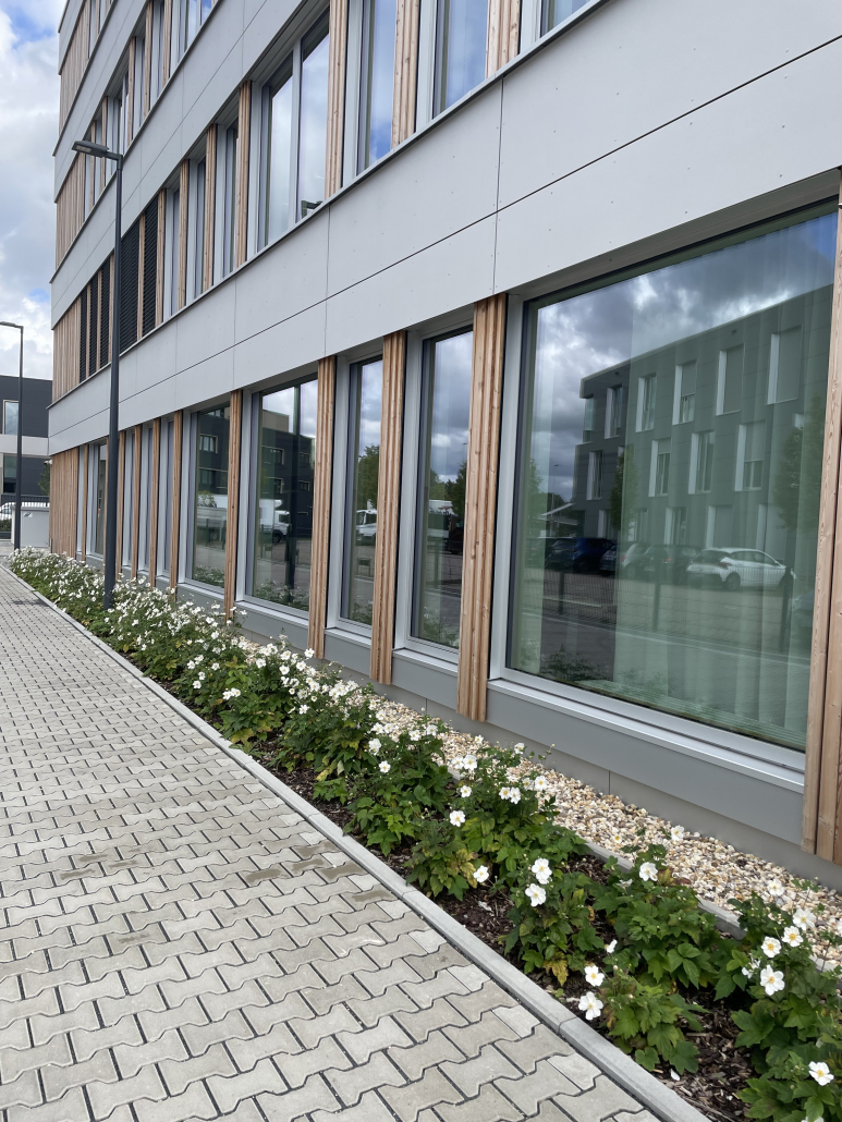 Weiter ging es nach Düsseldorf-Benrath zu den Paulshöfen, wo uns die Projektleiterin von BONAVA über die fertiggestellten Außenanlagen der Baufelder 1 und 2 führte. Von dort ging es weiter nach Hilden: Zunächst besuchten wir das gemeinschaftliche Wohnprojekt „Trialog Hilden“, ein Passivhaus mit 28 barrierefreien Wohnungen. Anschließend den „Technik Campus“ der Firma Soeffing Kälte Klima GmbH im Gewerbegebiet Giesenheide – ein Bauvorhaben mit Bürogebäude und Lagerhalle mit DGNB Gold Zertifizierung.